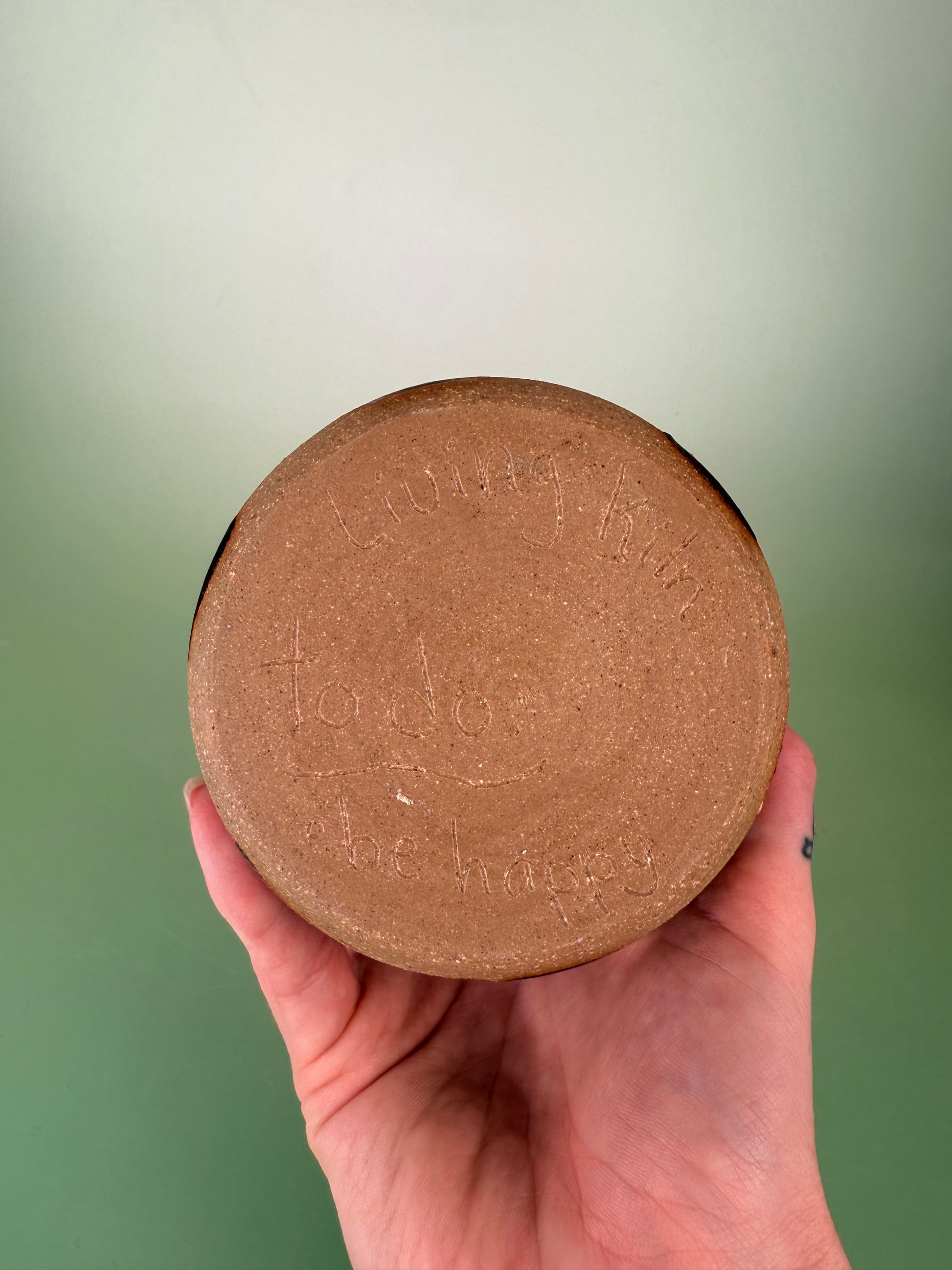 4 inches H. 3.5 inches W. 13 oz. Food safe. Black sparkly glaze is not microwave safe.