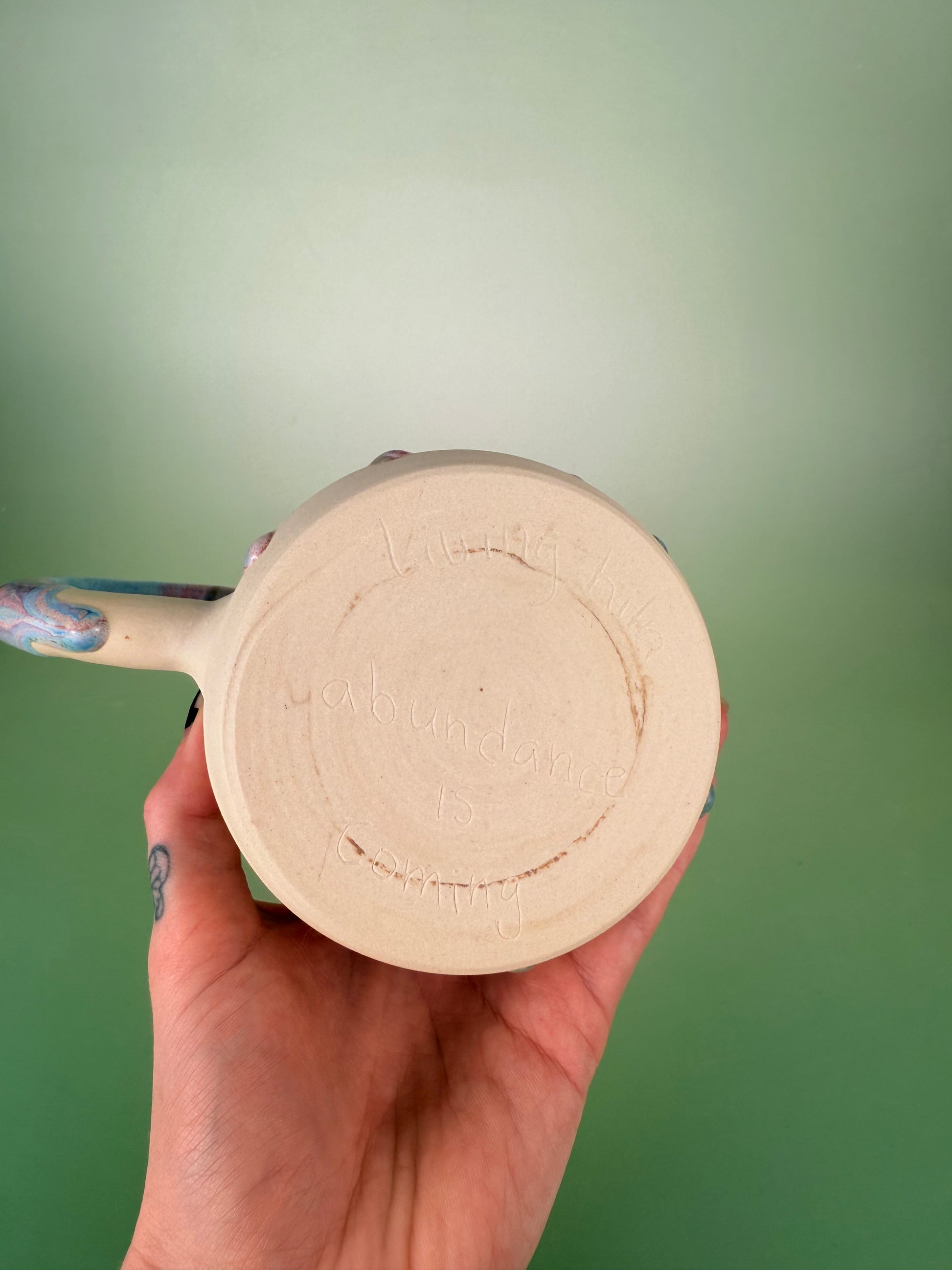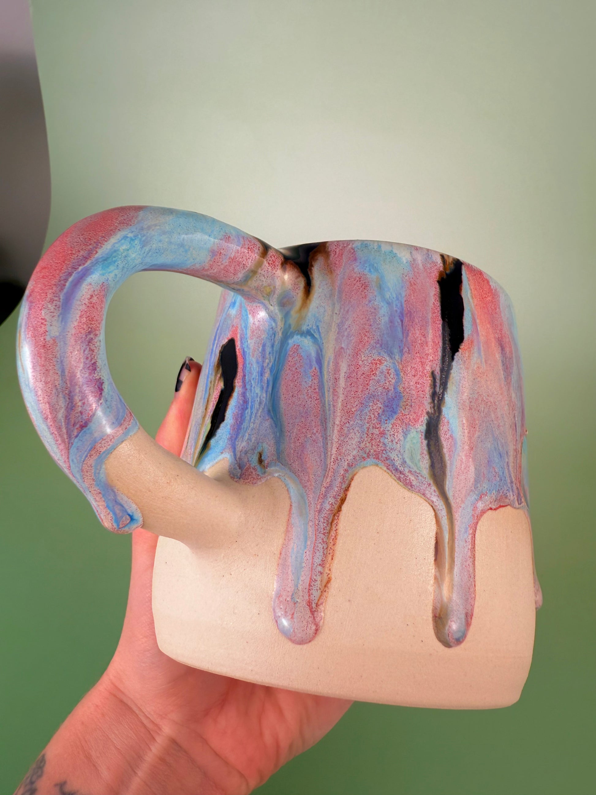 4 inches H. 3.5 inches W. 16 oz. Food safe. Black glaze is not microwave safe.