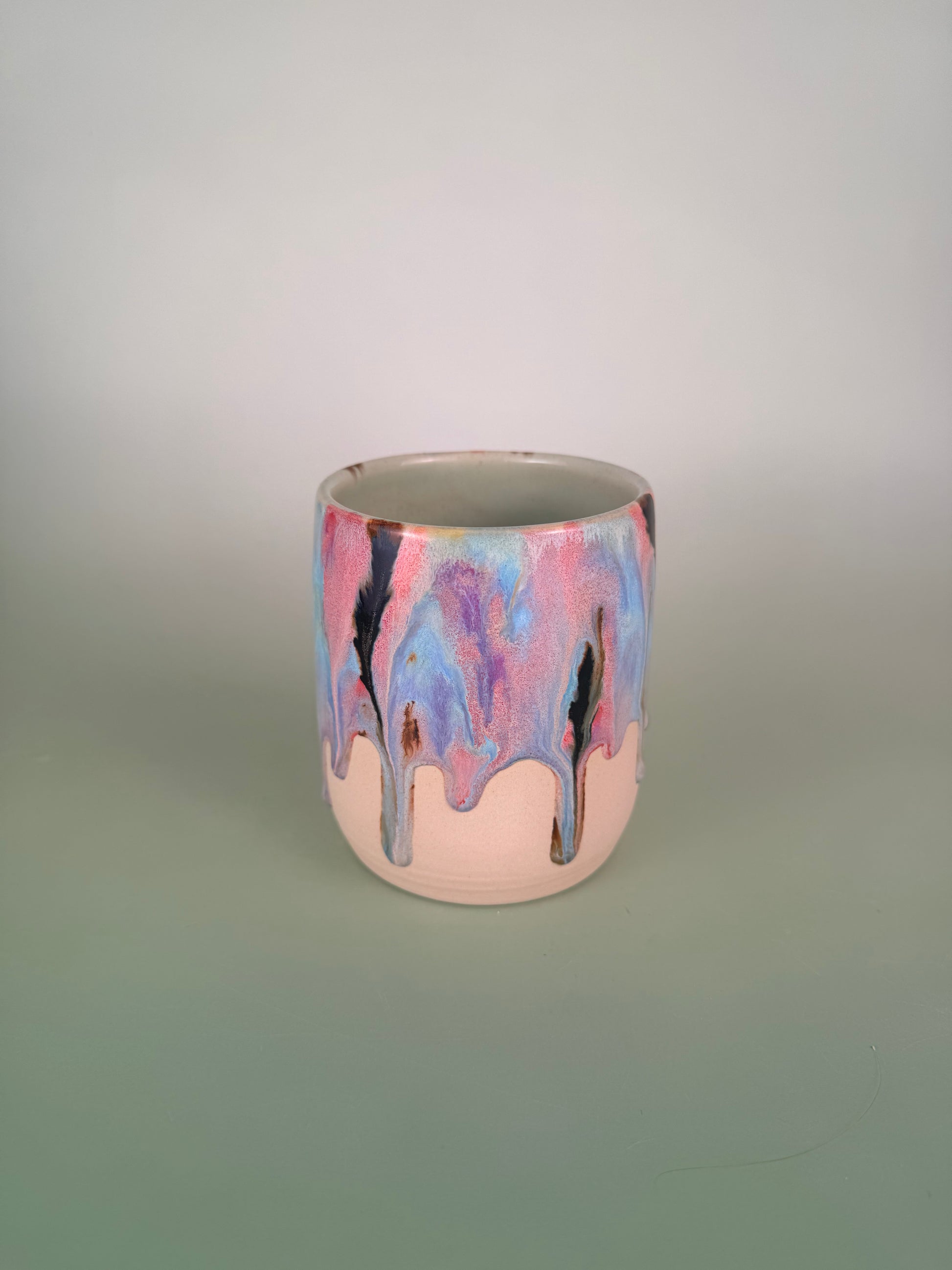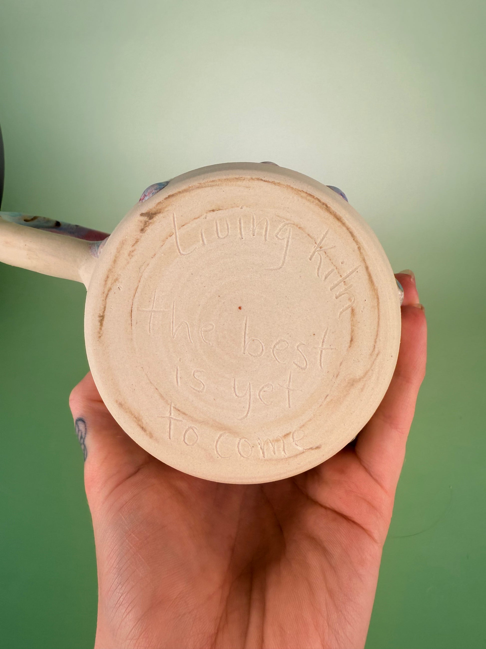 3 inches W. 4 inches W. 16 oz. Discounted due to small hairline crack on bottom handle. Bottom of the mug is marbled clay.