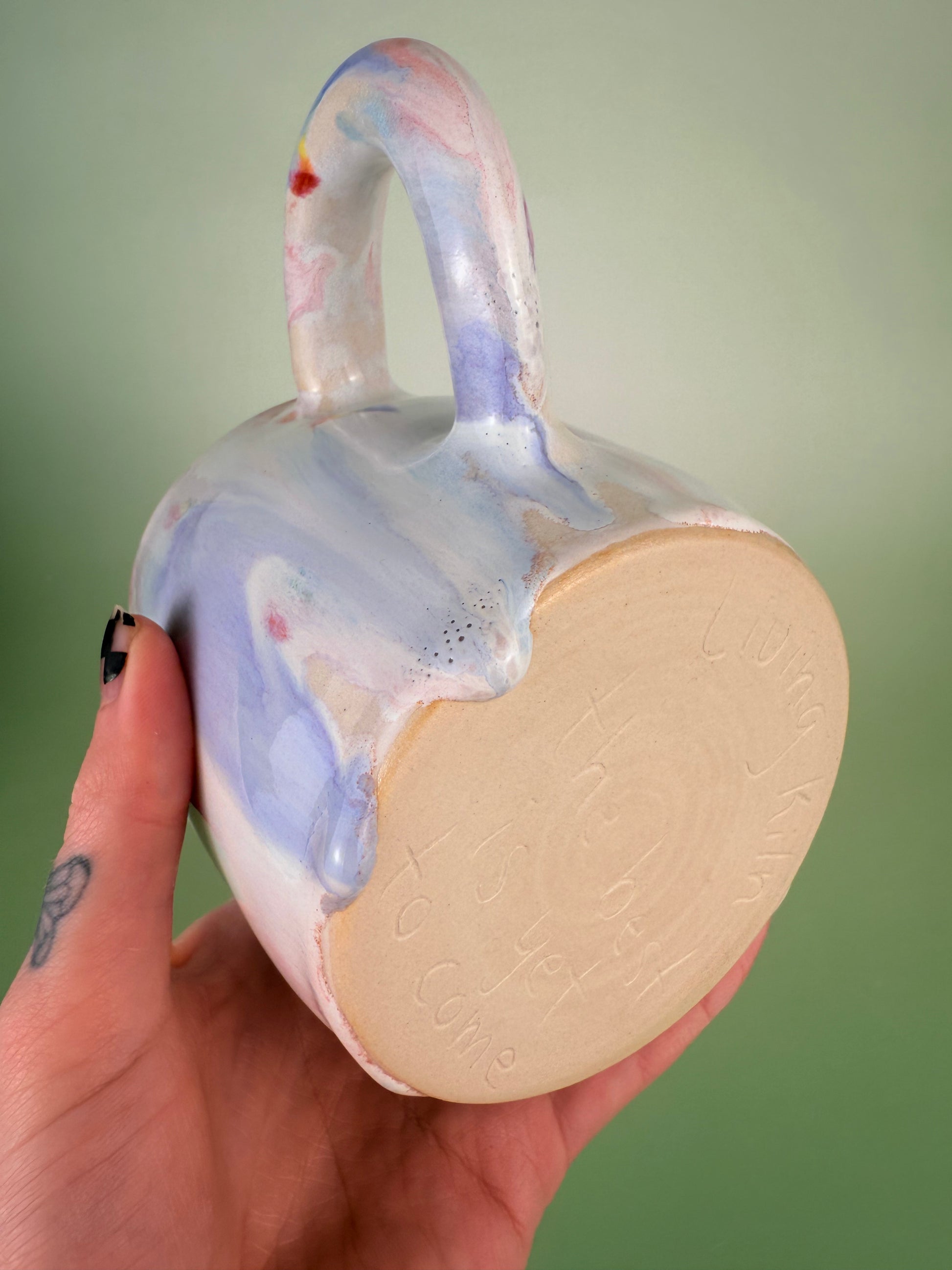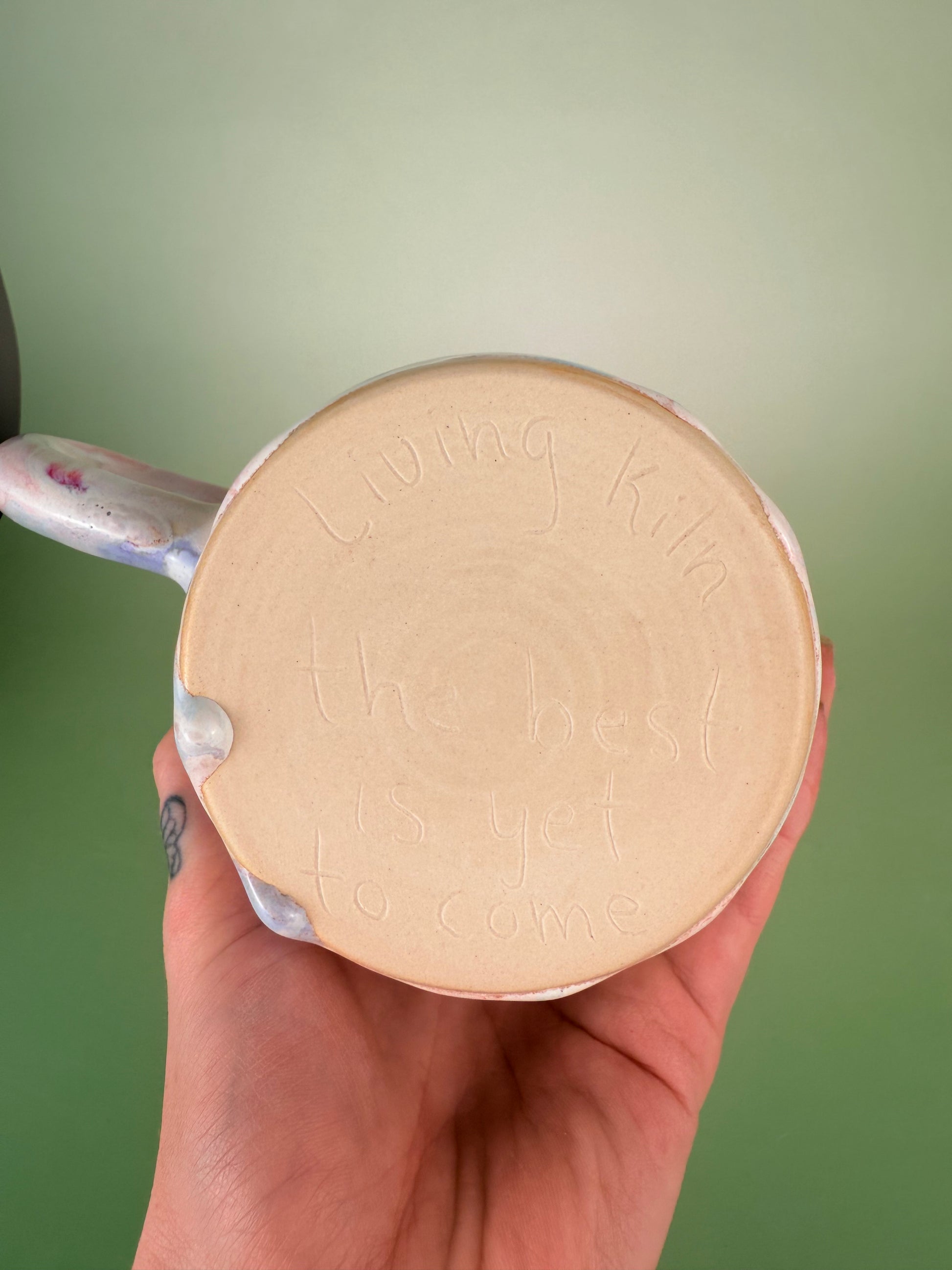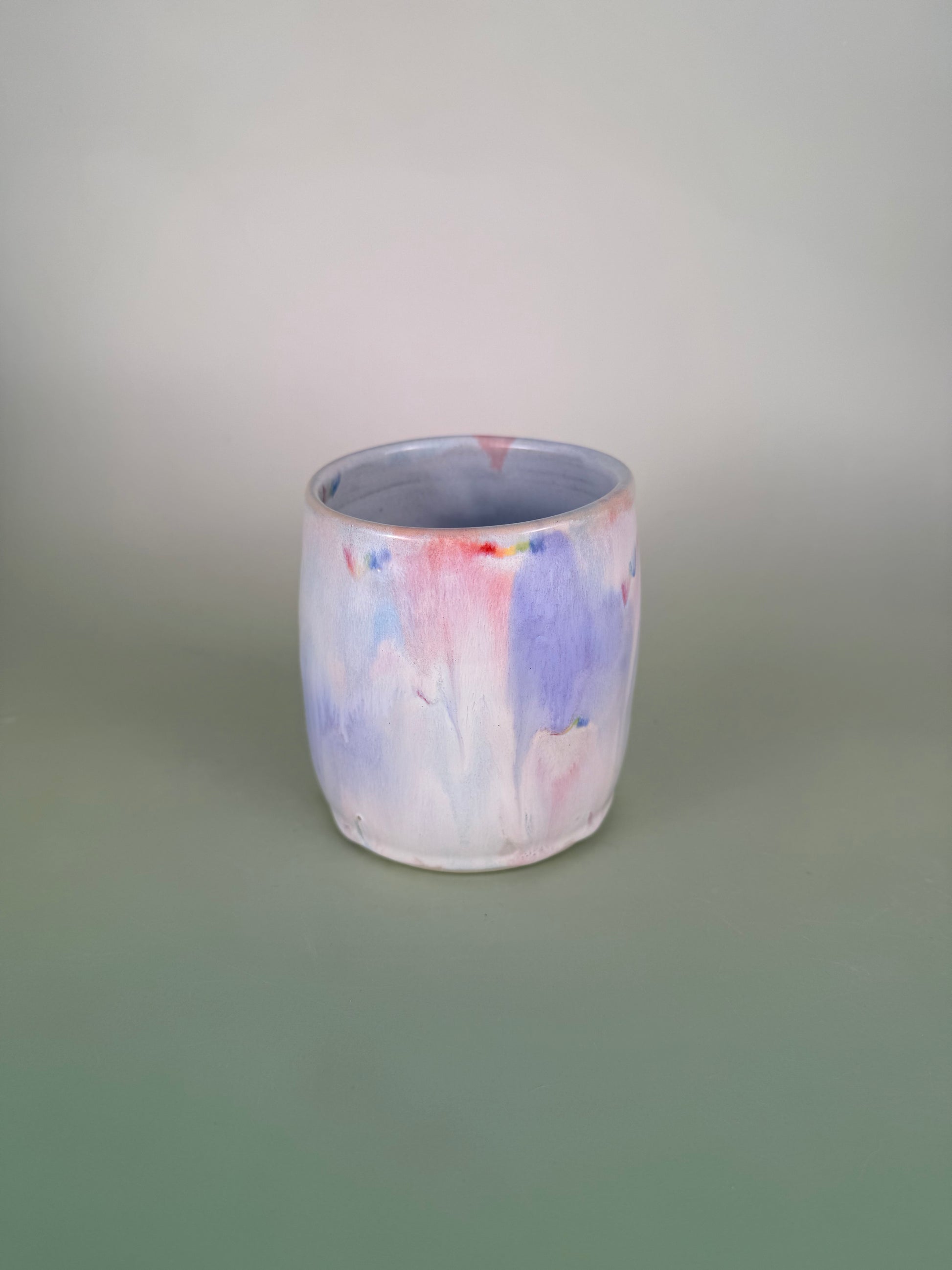 4 inches H. 3 inches W. 16 oz. Glaze is overrun so it doesn’t sit flat. Food safe.